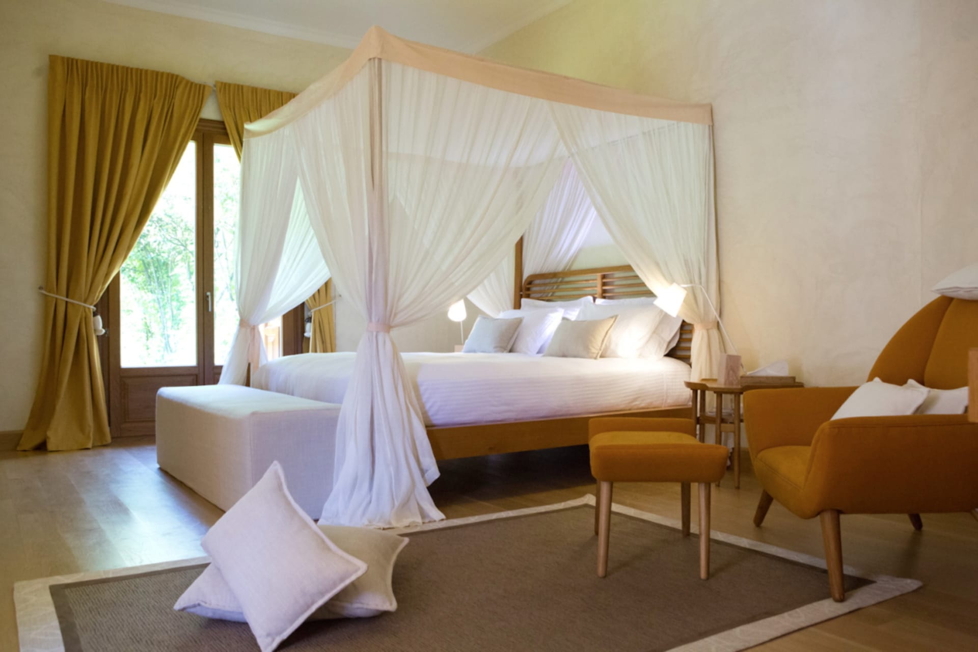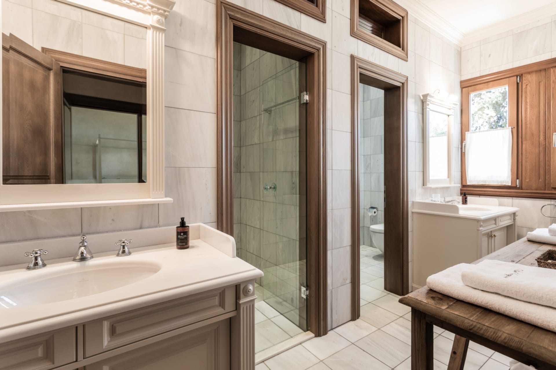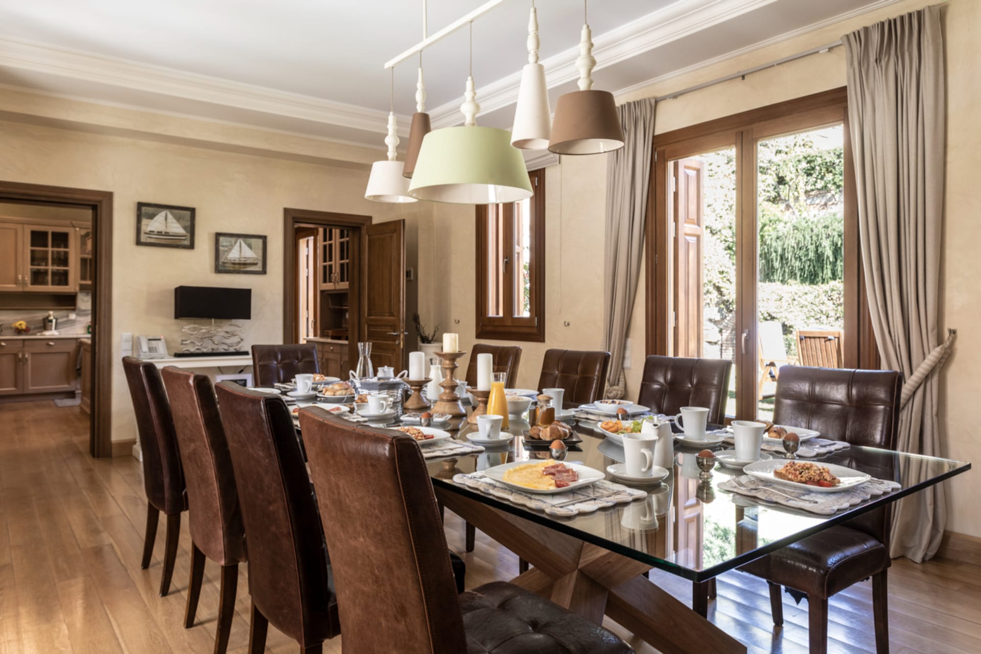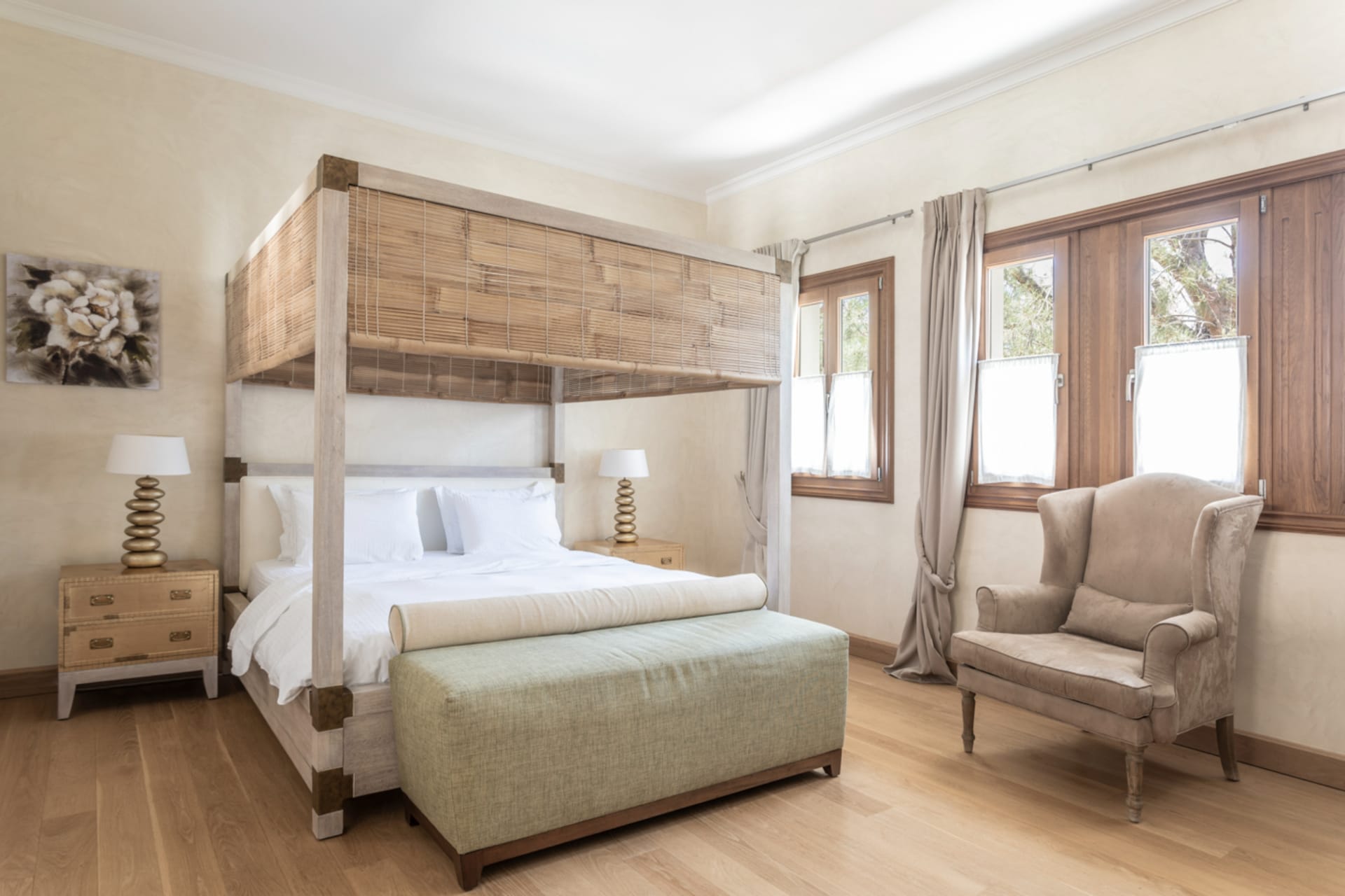 The villa accommodates up to 14 guests (maximum 12 adults) and features five beautifully appointed bedrooms, each offering a luxurious king-size bed and a private en-suite bathroom, ensuring absolute comfort and privacy for every guest. One of the bedrooms also includes an elegant sofa, ideal for additional sleeping arrangements or relaxation. A sixth common bathroom is available for added convenience.
